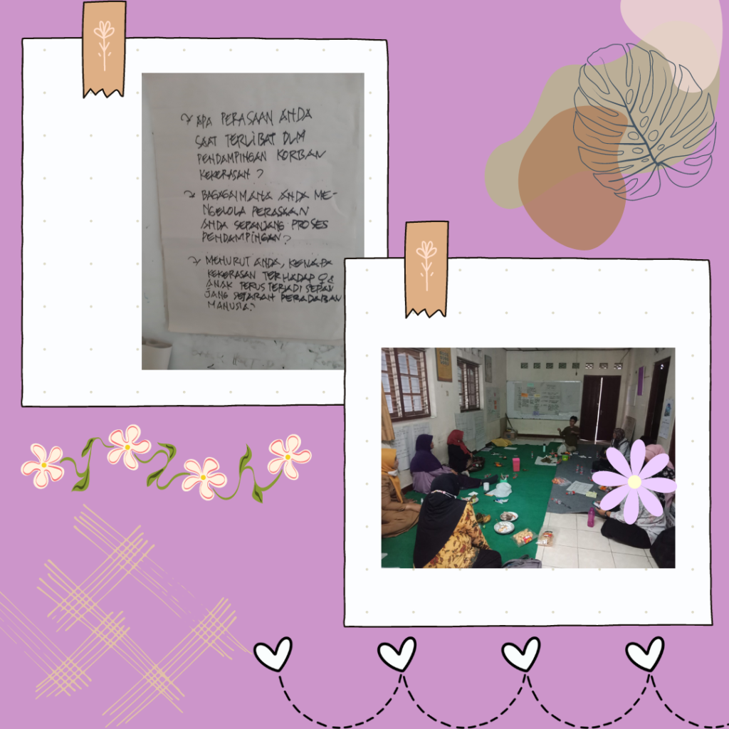 Melihat tingginya kasus kekerasan terhadap perempuan dan anak di Kabupaten Magelang seperti data di atas, Pada tanggal 7 Februari 2023 Sahabat Perempuan berinisiatif mengadakan pertemuan dengan jaringan. Jaringan meliputi Sahabat Perempuan P2TP2A Kabupaten Magelang, pekerja social, Unit PPA Polresta Magelang, dan Lembaga Advokasi Bumi (LAB). Pertemuan ini bertujuan untuk melakukan refleksi pendampingan selama 2022. Tidak hanya membahas kasus namun juga memetakan kendala dan hambatan baik eksternal maupun internal dari pendamping. Hal ini dilakukan karena proses pendampingan akan terhambat bila pendamping belum selesai dengan dirinya sendiri. Diskusi dan refleksi ini dipandu oleh Helmy Widyawati (Sahabat Perempuan). Dalam pertemuan ini para pendamping menyampaikan bagaimana awal mula terlibat dalam layanan, lesson learn sepanjang proses pendampingan, cara pengelolaan perasaan sepanjang pendampingan, dan juga membahas mengapa kasus kekerasan terhadap perempuan dan anak terus terjadi sepanjang sejarah peradaban manusia.